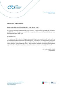 “Il Presidente del CONI, Giovanni Malagò, recependo le indicazioni contenute nel DPCM odierno, invita le Federazioni Sportive Nazionali, le Discipline Sportive Associate e gli Enti di Promozione Sportiva a sospendere ogni evento sportivo in programma sabato 26 aprile, nella giornata delle esequie del Santo Padre Francesco, rinnovando altresì l’invito a far osservare un minuto di silenzio nelle manifestazioni agonistiche che si disputeranno nell’arco della settimana per onorare la memoria del Pontefice”.