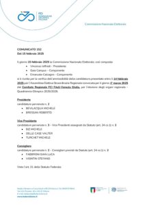 si è riunita per la verifica dell’ammissibilità delle candidature presentate entro il 14 febbraio 2025 per l’Assemblea Elettiva Straordinaria Regionale convocata per il giorno 1° marzo 2025 dal Comitato Regionale FCI Friuli-Venezia Giulia, per l’elezione degli organi regionale – Quadriennio Olimpico 2025/2028.