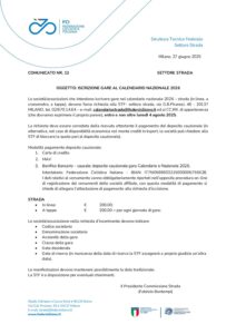 Le società/associazioni che intendono iscrivere gare nel calendario nazionale 2026 – strada (in linea, a cronometro, a tappe), devono farne richiesta alla STF- settore strada, via G.B.Piranesi, 46 – 20137 MILANO, tel. 02/670.14.64 – e-mail: calendariostrada@federciclismo.it ed ai CC.RR. di appartenenza (che dovranno esprimere il proprio parere), entro e non oltre lunedì 4 agosto 2025.