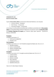 si è riunita per la verifica dell’ammissibilità delle candidature presentate entro il 29 novembre 2024 per l’Assemblea Elettiva Ordinaria Regionale convocata per il giorno 14 dicembre 2024 dal Comitato Regionale FCI Liguria, per l’elezione degli organi regionale – Quadriennio Olimpico 2025/2028.