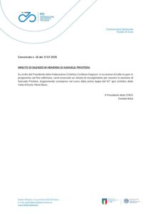 Su invito del Presidente della Federazione Ciclistica Cordiano Dagnoni, in occasione di tutte le gare in programma nel fine settimana, verrà osservato un minuto di raccoglimento per onorare la memoria di Samuele Privitera, tragicamente scomparso nel corso della prima tappa del 61° giro ciclistico della Valle d’Aosta-Mont Blanc.