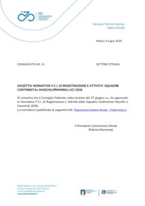 Si comunica che il Consiglio Federale, nella riunione del 27 giugno u.s., ha approvato le Normative F.C.I. di Registrazione e Attività delle Squadre Continental Maschili e Femminili 2026.