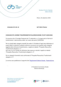 Si comunica che il Consiglio Federale del 17 settembre u.s. ha approvato le Norme di trasferimento / valorizzazione atleti, con valore del punto 2025/2026.
