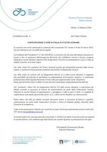 Si ricorda inoltre che, come previsto dal comunicato n° 15/2022, gli atleti Ucraini tesserati e/o registrati in società italiane, sono parificati agli atleti italiani per quanto riguarda la partecipazione alle gare.