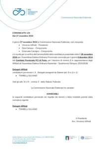si è riunita per la verifica dell’ammissibilità delle candidature presentate entro il 26 novembre 2024 per l’Assemblea Elettiva Ordinaria Provinciale convocata per il giorno 6 dicembre 2024 dal Comitato Provinciale FCI di Prato, per l’elezione di numero 1 in rappresentanza degli Affiliati all’Assemblea Elettiva Ordinaria Nazionale – Quadriennio Olimpico 2025/2028.