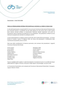 In vista dell’organizzazione, da parte dell’UCI, di un corso per Commissari Internazionali Strada previsto per il prossimo autunno, e considerato che allo stato attuale non sono ancora noti se, quali e quanti posti saranno riservati all’Italia, la Commissione Nazionale intende organizzare una prova di preselezione interna finalizzata alla definizione di una graduatoria. Tale graduatoria costituirà uno dei criteri per la proposta dei nominativi da sottoporre all’UCI.