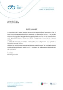 Si comunica a tutti i Comitati Regionali, ai responsabili Regionali delle Commissioni e tutte le figure che fanno capo alla Commissione Nazionale, che la scrivente C.N.D.C.S. e la Lega del Ciclismo Professionistico hanno avviato una interlocuzione con UCI al fine del riconoscimento della figura del Direttore di Corsa come Safety Manager, che al momento non è ancora definita.