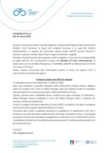 Pertanto, a fronte di quanto sopra esposto e sotto in allegato, si comunica che c’è disponibilità da parte dell’UCI, pur riconoscendo la figura del Direttore di Corsa Internazionale, di organizzare un corso di Safety Manager per i nostri D.C.I. e D.C.P. la settimana dal 24-25-26 con esame il 27 marzo.