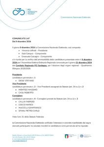 si è riunita per la verifica dell’ammissibilità delle candidature presentate entro il 6 dicembre 2024 per l’Assemblea Elettiva Ordinaria Regionale convocata per il giorno 21 dicembre 2024 dal Comitato Regionale FCI Sardegna, per l’elezione degli organi regionali – Quadriennio Olimpico 2025/2028.