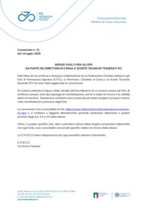 Nell’ottica di una proficua e sinergica collaborazione tra la Federazione Ciclistica Italiana e gli Enti di Promozione Sportiva (E.P.S.), si informano i Direttori di Corsa e le Scorte Tecniche tesserati FCI che sono state aggiornate le convenzioni.