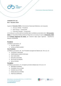 si è riunita per la verifica dell’ammissibilità delle candidature presentate entro il 30 novembre 2024 per l’Assemblea Elettiva Ordinaria Regionale convocata per il giorno 15 dicembre 2024 dal Comitato Regionale FCI Sicilia, per l’elezione degli organi regionale – Quadriennio Olimpico 2025/2028.