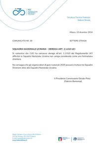 Si comunica che l’UCI ha concesso deroga all’art. 2.1.010 del Regolamento UCI affinché la Squadra Nazionale Ucraina non venga considerata come una formazione straniera.