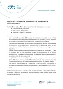 - che, solo successivamente all’adozione della decisione contenuta nel comunicato n.127 del 28 novembre 2024, in data 29 novembre 2024 è pervenuta, da parte del sig. Balloni Alfredo missiva, corredata da documentazione, con la quale lo stesso rappresentava di far parte del consiglio direttivo della società;