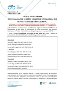 La Scuola Tecnici ha programmato un corso di formazione per Tecnico Allenatore Categorie Agonistiche Internazionali (TA3) che si svolgerà interamente in presenza a Novi Ligure (AL).