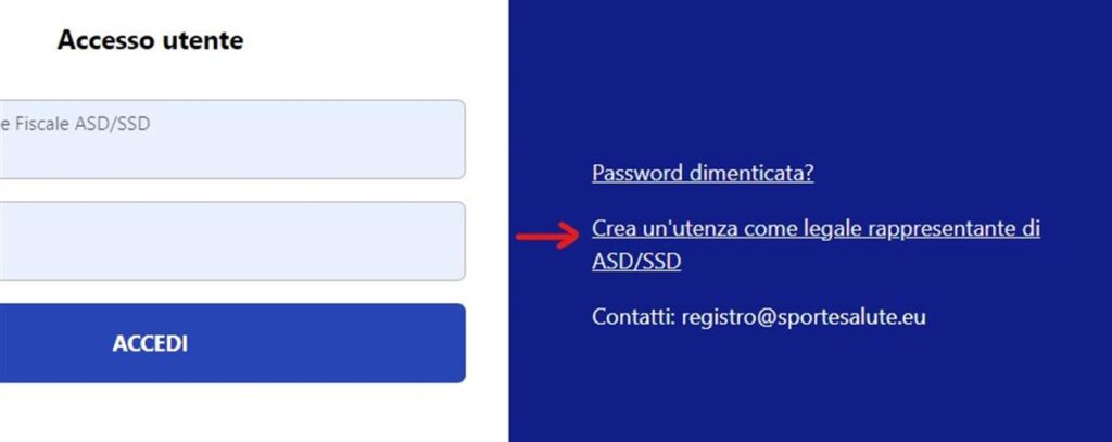 I legali rappresentanti delleโฏASD/SSD, dovranno cliccare sulla voce in homepage โCREA UNโUTENZA COME LEGALE RAPPRESENTANTE DI ASD/SSDโ
