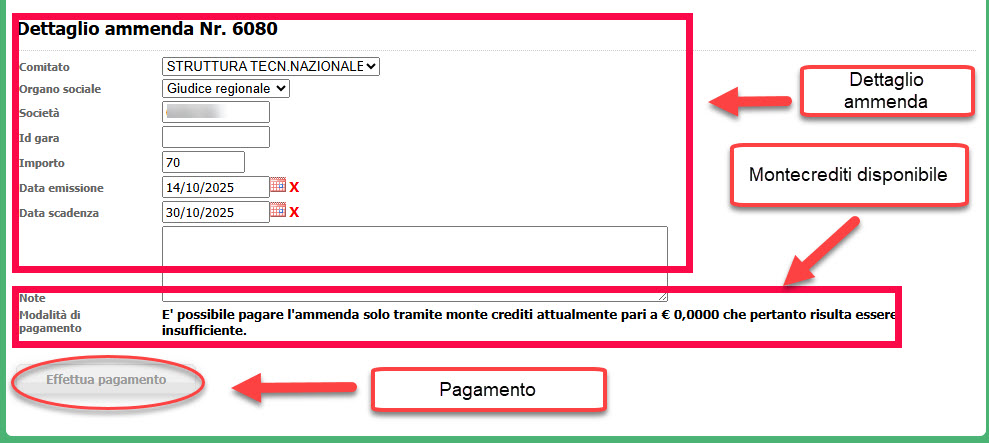 La modalità di pagamento, per qualsiasi tipo di ammenda, è esclusivamente tramite il credito della società.