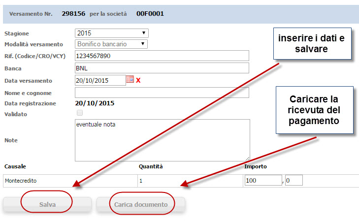 Accedendo alla sezione “Versamenti” e scegliendo l’opzione bonifico bancario si aprirà una scheda di registrazione del versamento.